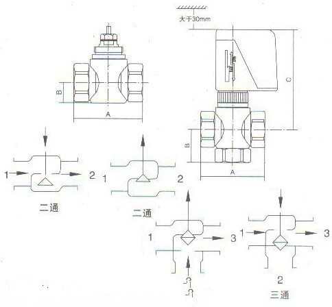 三、VA7010系列風(fēng)機(jī)盤管電動閥結(jié)構(gòu)、尺寸及安裝示意圖: